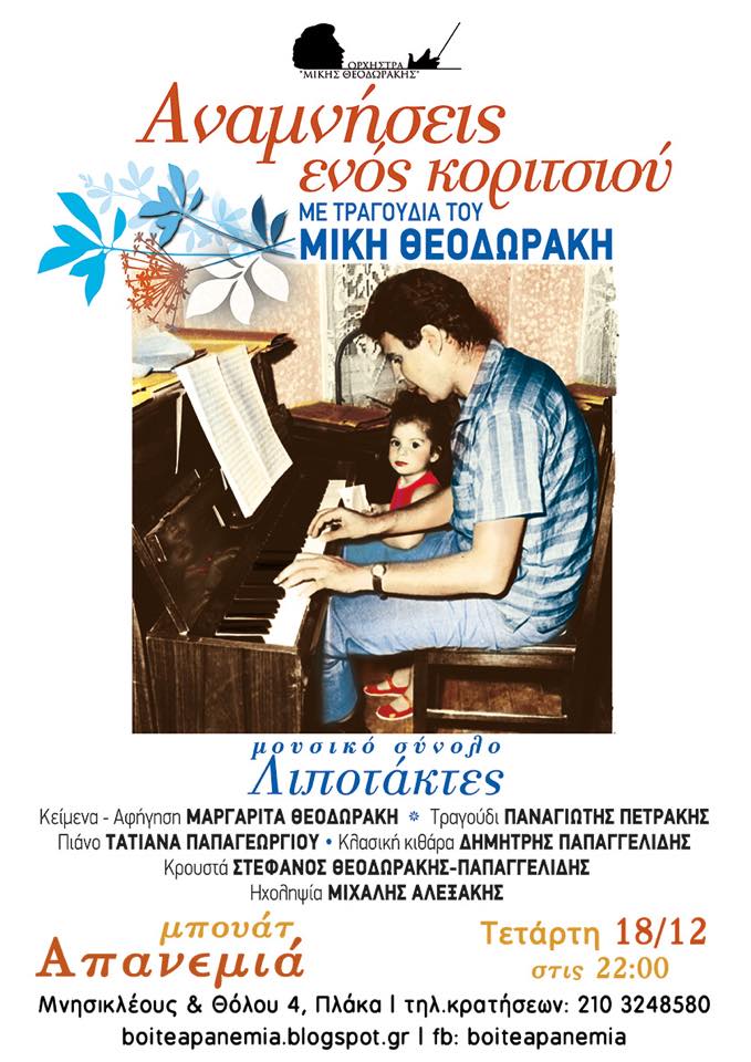 Το μουσικό σύνολο "Λιποτάκτες" παρουσιάζει την Τετάρτη 18 Δεκεμβρίου 2019 στις 10μ.μ. στην μπουάτ Απανεμιά τις "Αναμνήσεις ενός κοριτσιού" με τραγούδια του Μίκη Θεοδωράκη και αφήγηση αππο την Μαργαρίτα Θεοδωράκη.