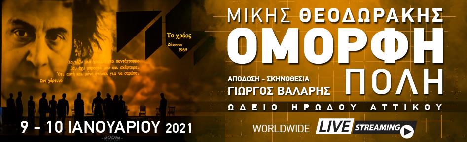 Η «Όμορφη πόλη» του Μίκη Θεοδωράκη σε απόδοση-σκηνοθεσία Γιώργου Βάλαρη, η θεατρική – μουσική υπερπαραγωγή της χρονιάς, που υμνήθηκε από κοινό και κριτικούς, μετά από τις sold out παραστάσεις στο Μέγαρο Μουσικής Αθηνών – Θεσσαλονίκης και στο Ηρώδειο, θα προβληθεί διαδικτυακά σε online streaming – worldwide με μιας υψηλής τεχνολογικής κάλυψης ήχου και εικόνας της παράστασης από το Ηρώδειο, μόνο για δύο ημέρες στις 9 και 10 Ιανουαρίου 2021, μέσω της πλατφόρμας του VIVA.GR, ώστε να την απολαύσει όλος ο κόσμος τόσο στην Ελλάδα όσο και στο εξωτερικό.