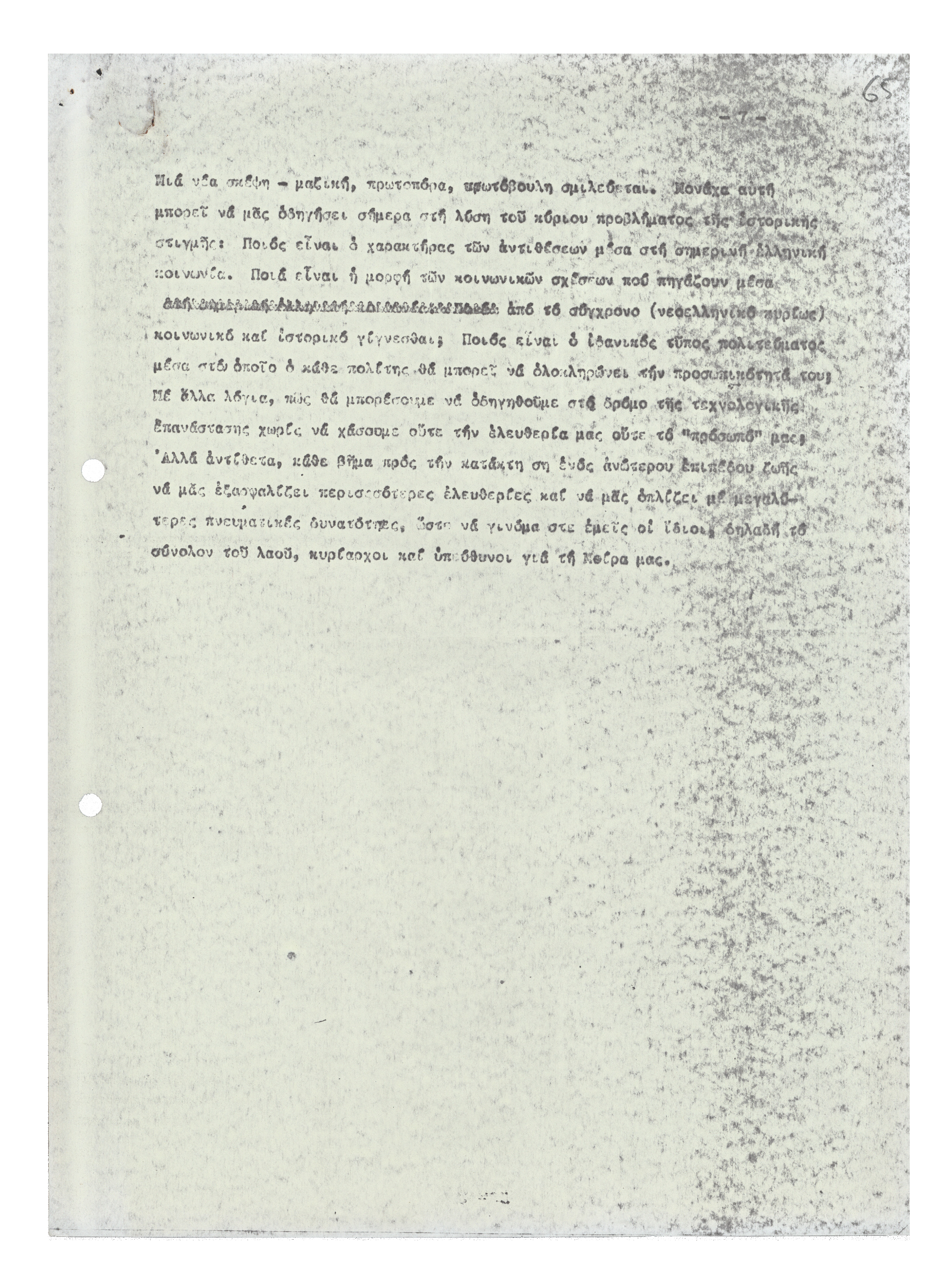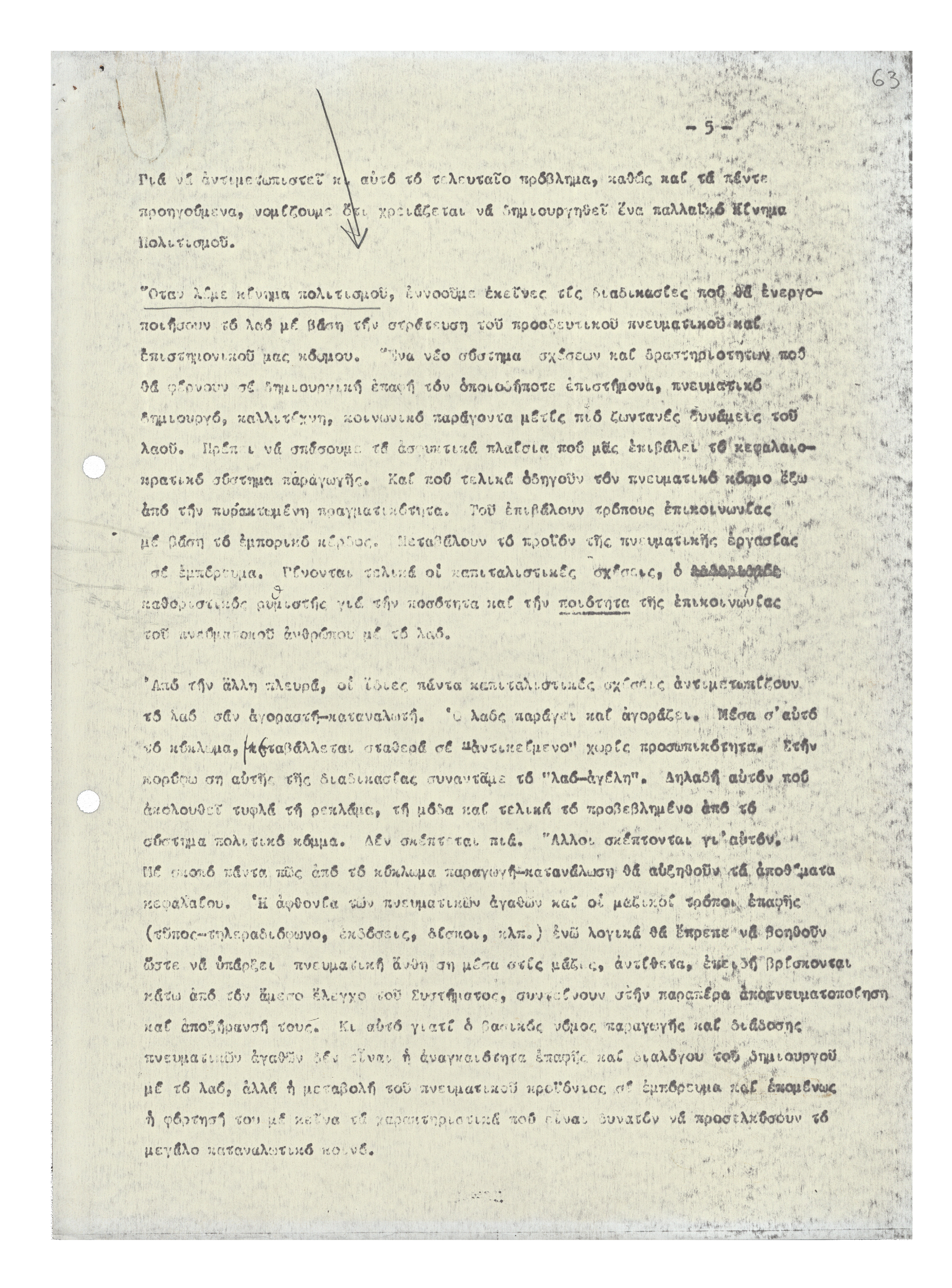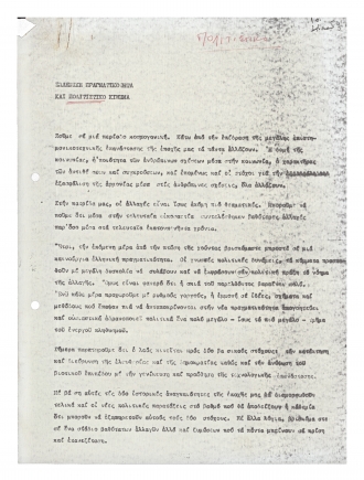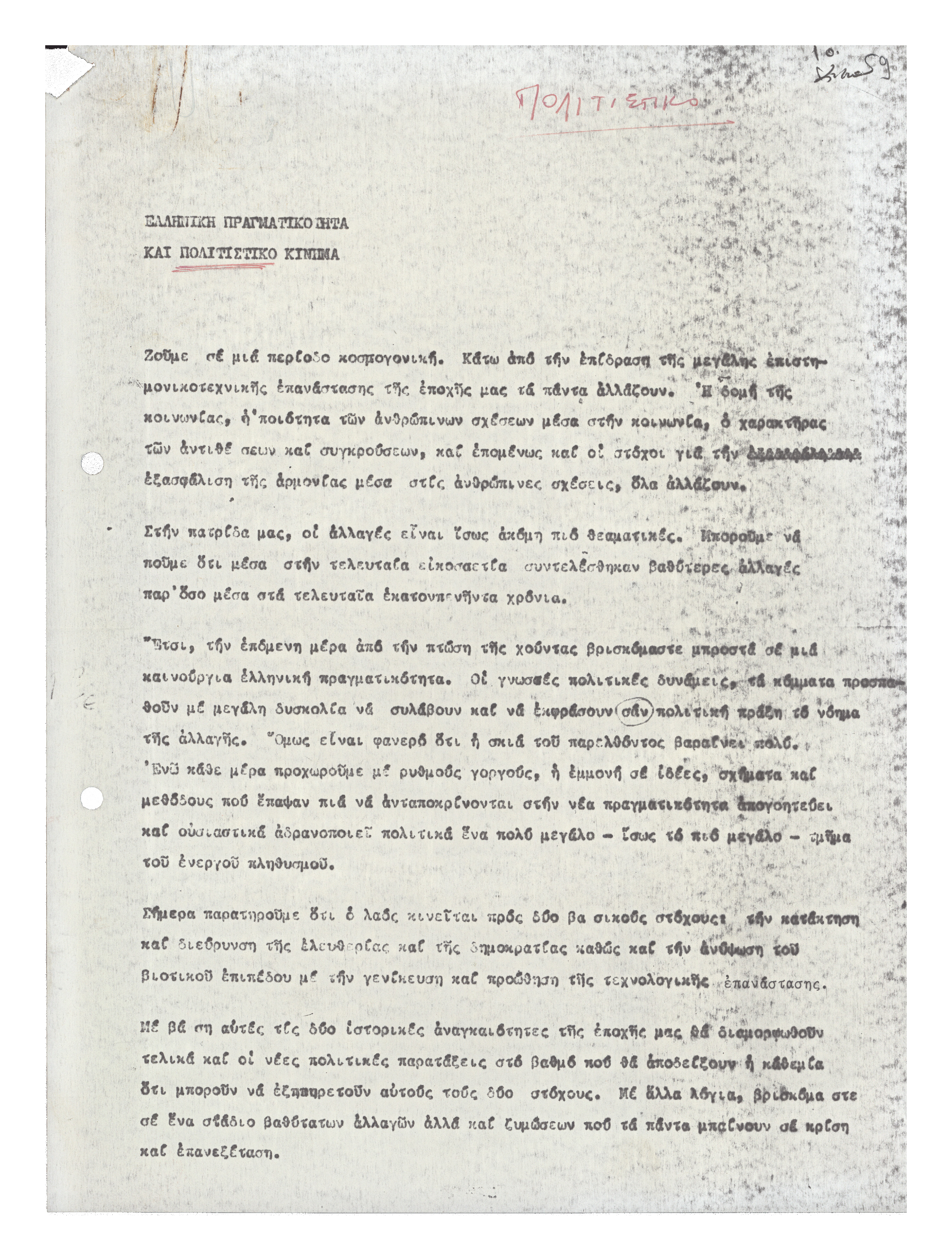 Ελληνική πραγματικότητα και πολιτιστικό κίνημα 12.02.2014 Περιγραφή της ελληνικής πολιτιστικής πραγματικότητας της χώρας και προτάσεις για την βελτίωση της κατάστασης. Δακτυλόγραφο κείμενο της δεκαετίας του 1980