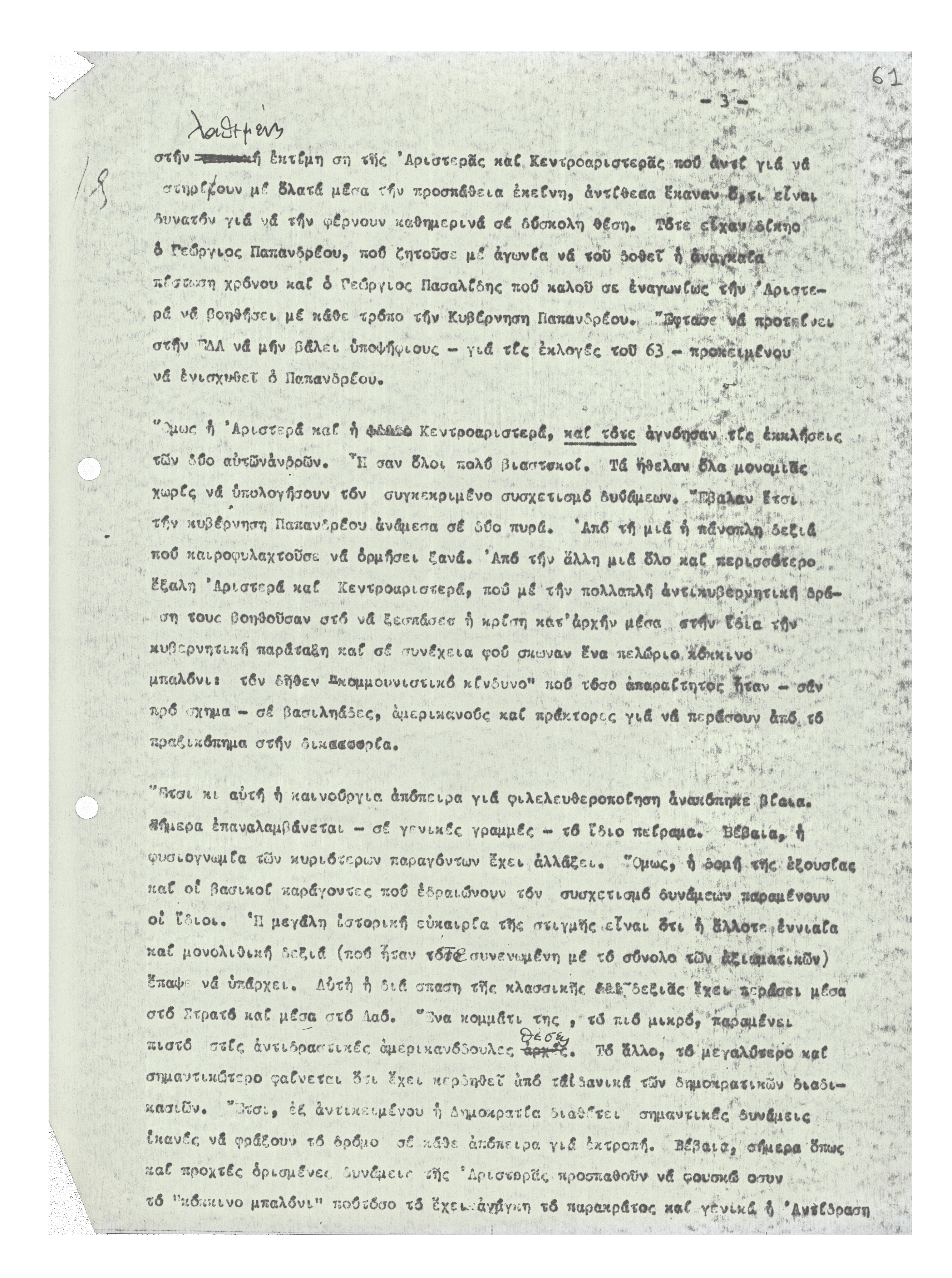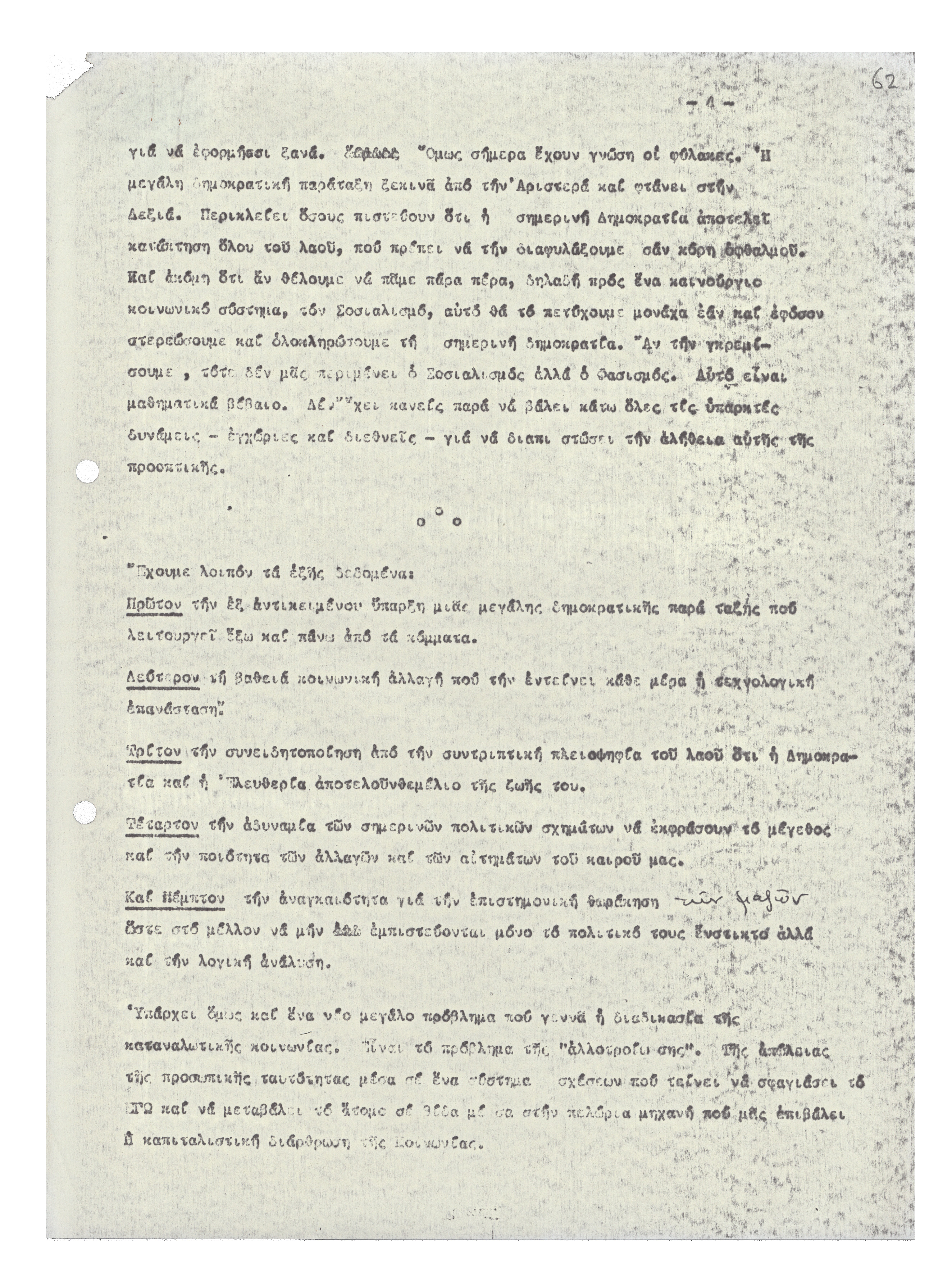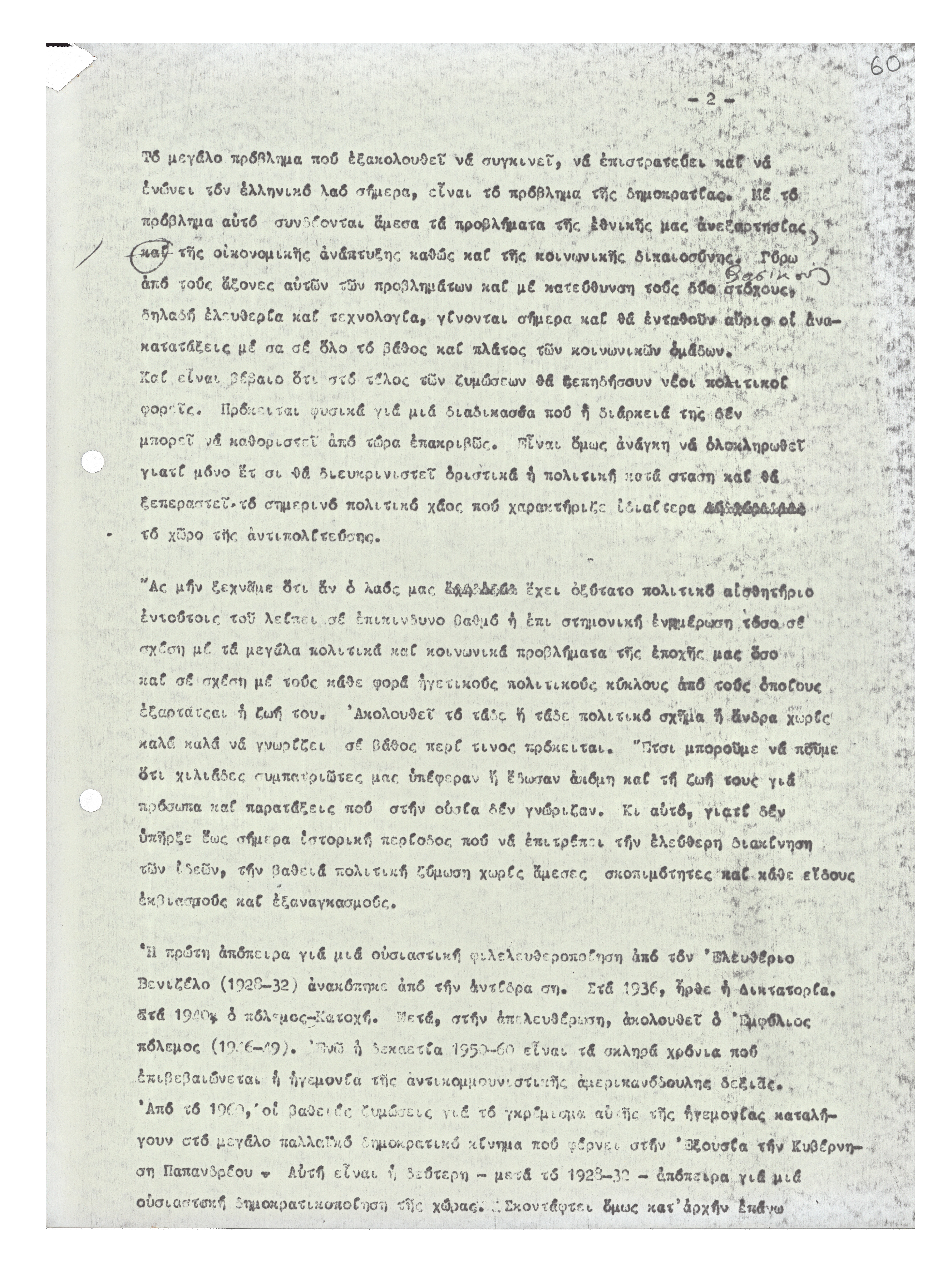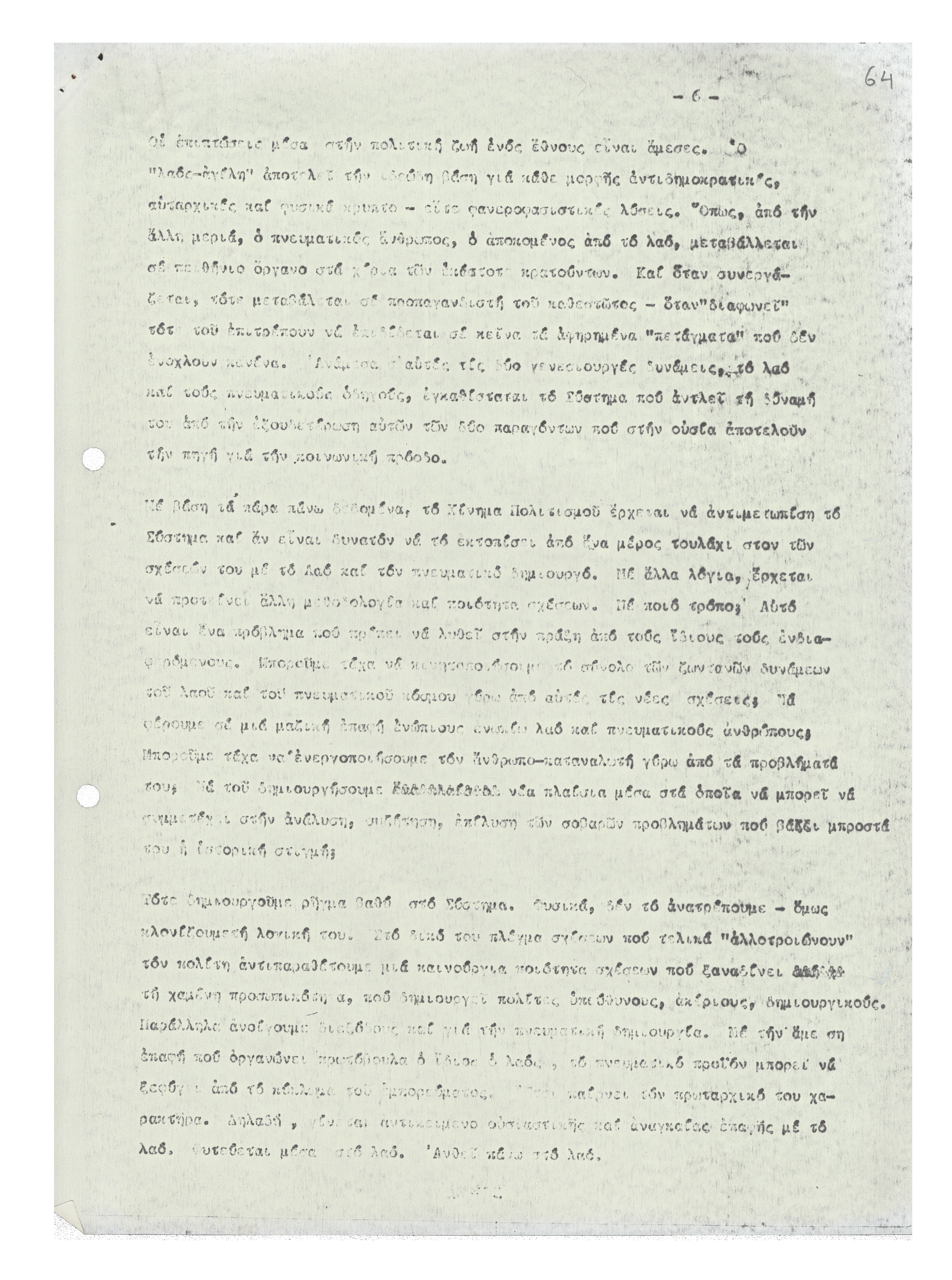 Ελληνική πραγματικότητα και πολιτιστικό κίνημα 12.02.2014 Περιγραφή της ελληνικής πολιτιστικής πραγματικότητας της χώρας και προτάσεις για την βελτίωση της κατάστασης. Δακτυλόγραφο κείμενο της δεκαετίας του 1980