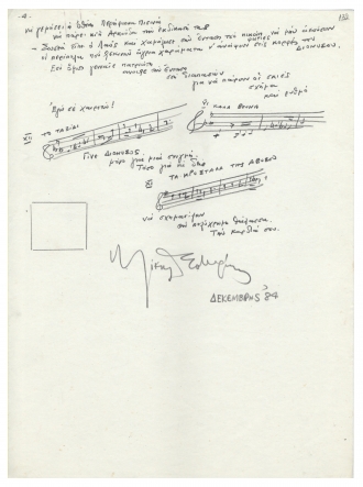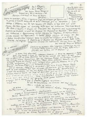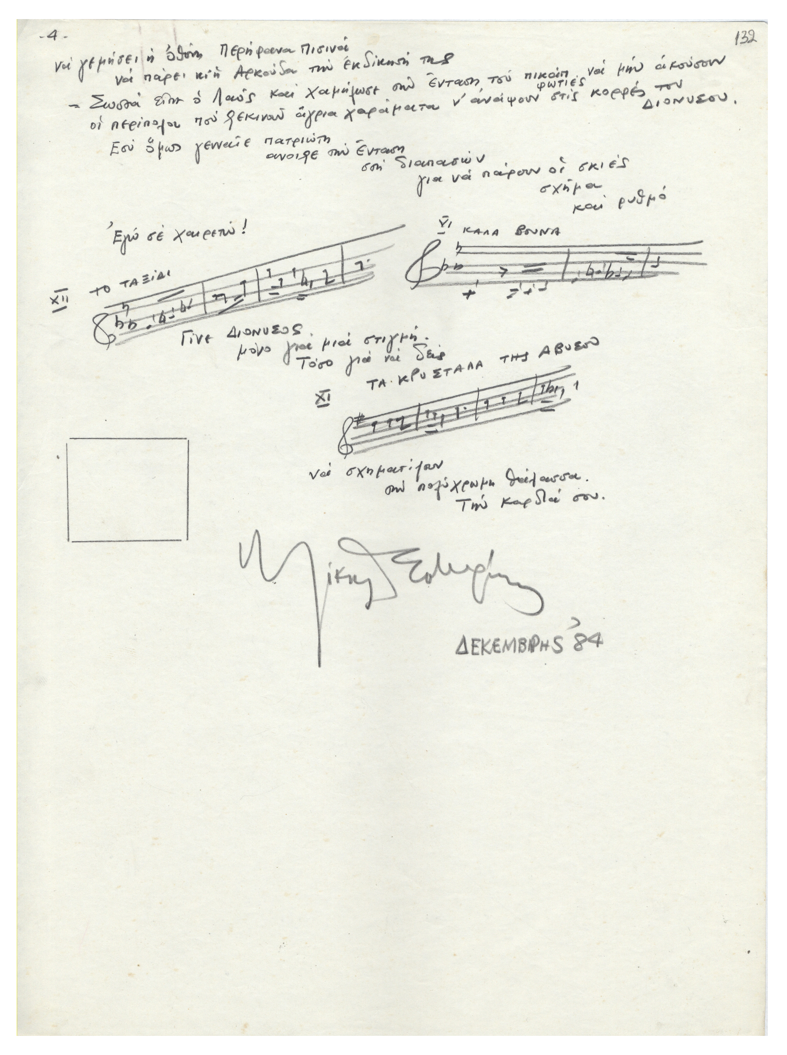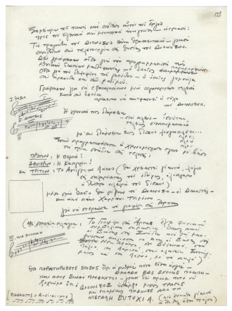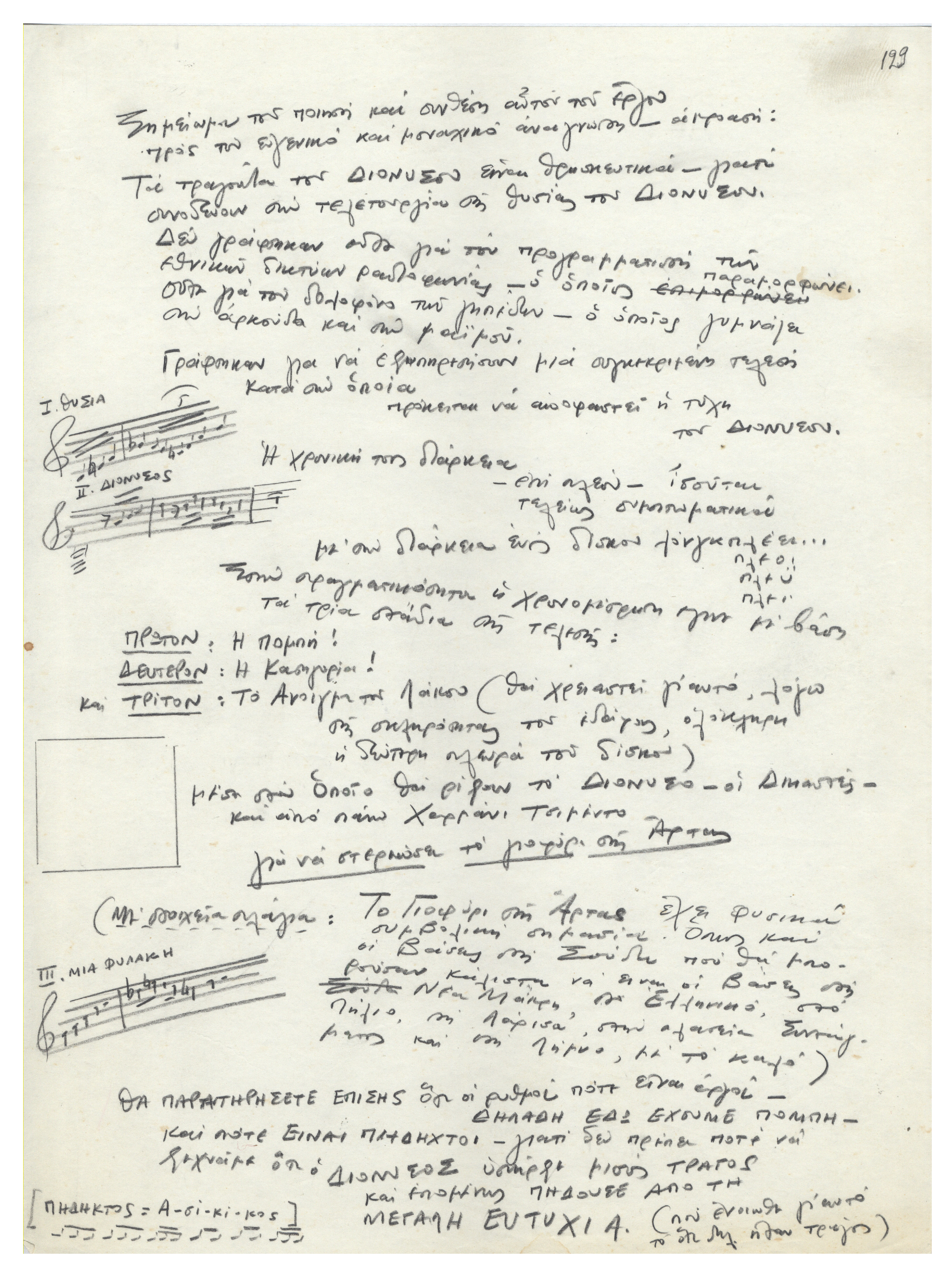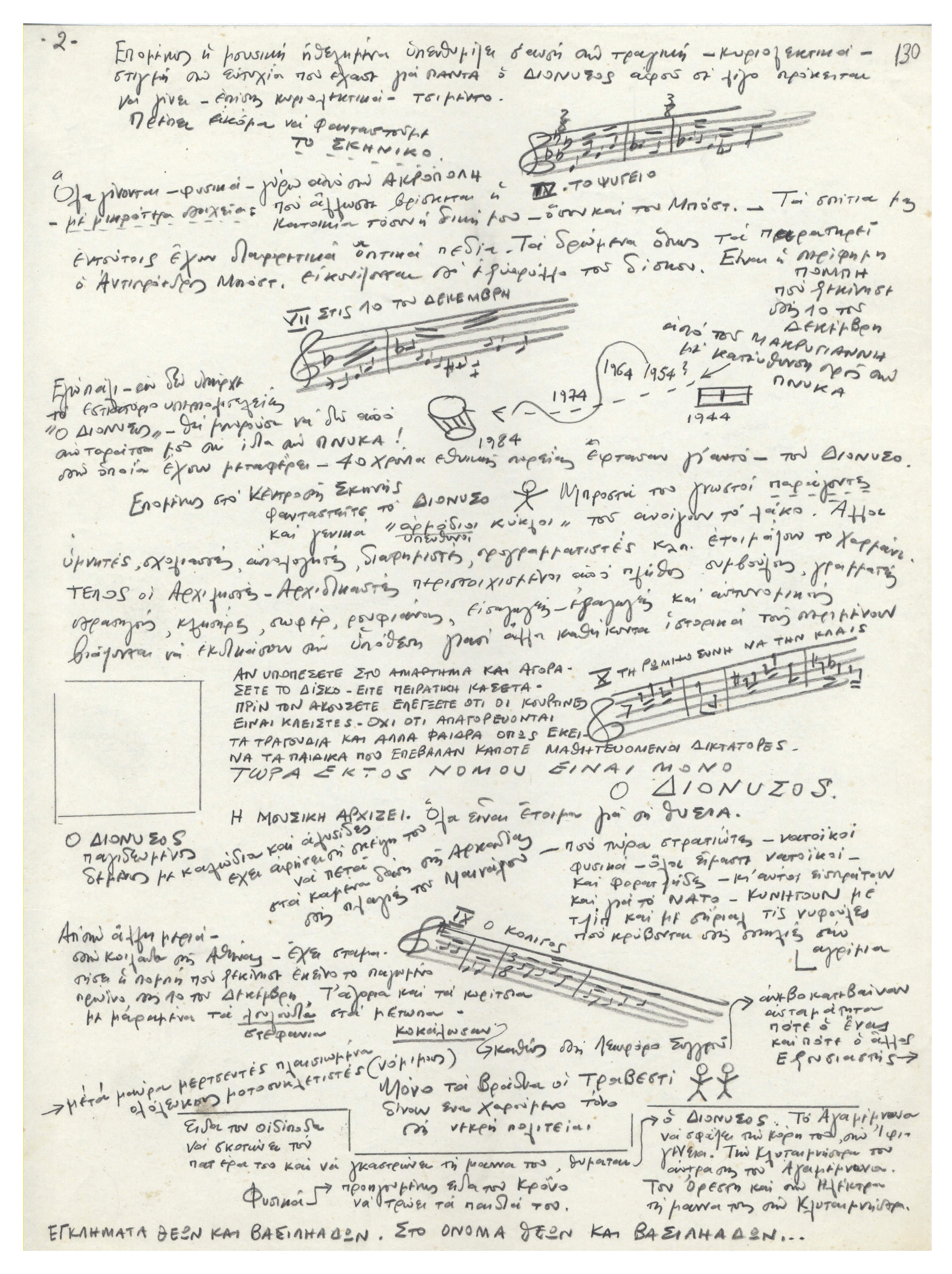 Σημείωμα του ποιητή και συνθέτη αυτού του έργου προς το μοναχικό αναγνώστη - ακροατή 13.02.2014 Σημείωμα του Μίκη Θεοδωράκη για το έργο Διόνυσος με σκίτσα και νότες σε αυτοσχέδια πεντάγραμμα