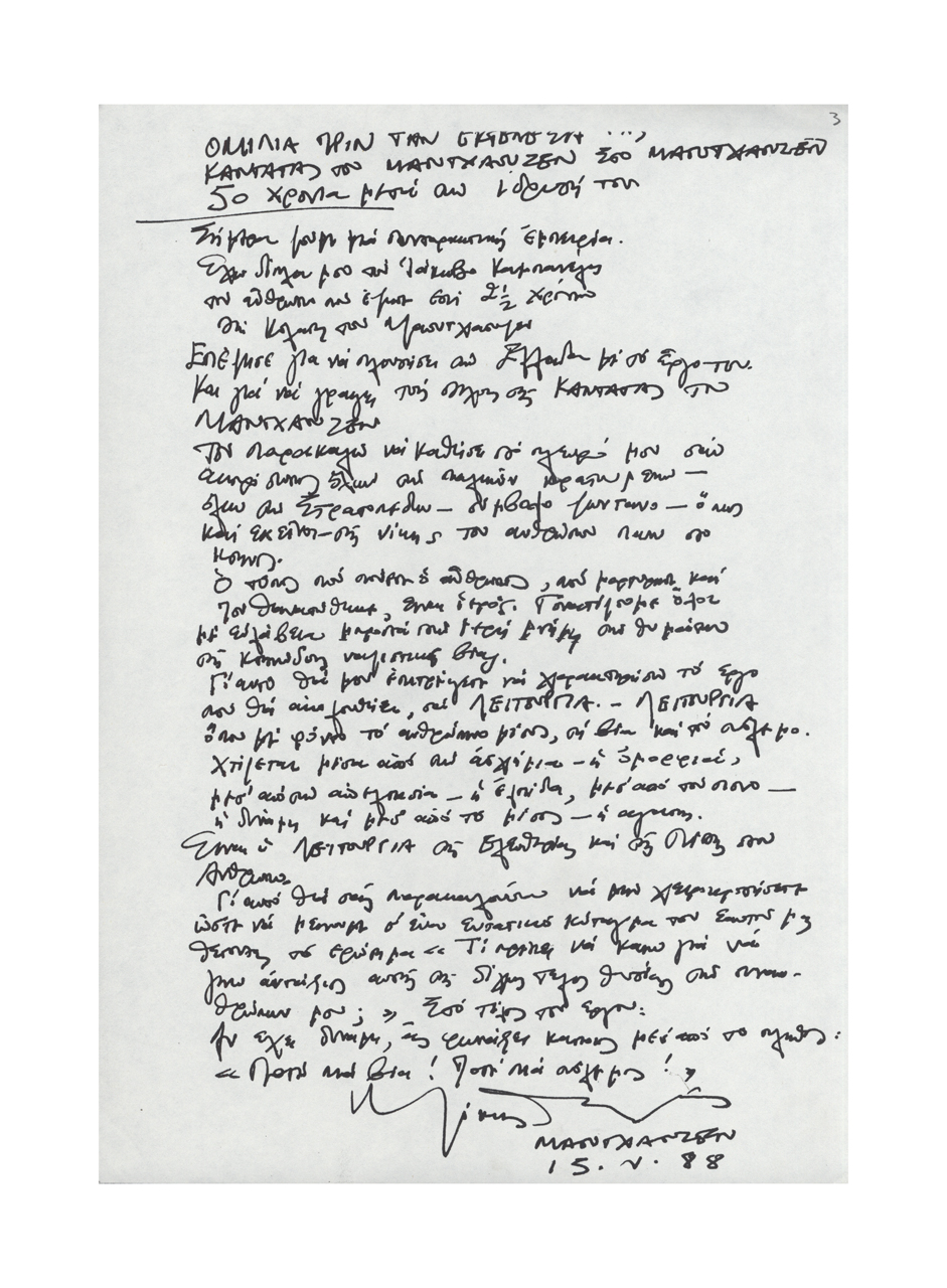 Ομιλία πριν την εκτέλεση της καντάτας του Μαουτχάουζεν, στο Μαουτχάουζεν 50 χρόνια μετά την ίδρυσή του 13.02.2014 Επετειακή συναυλία στο Μαουτχάουζεν τον Μάϊο 1988 για τα 50 χρόνια από την ίδρυση του στρατοπέδου, με το ομώνυμο έργο