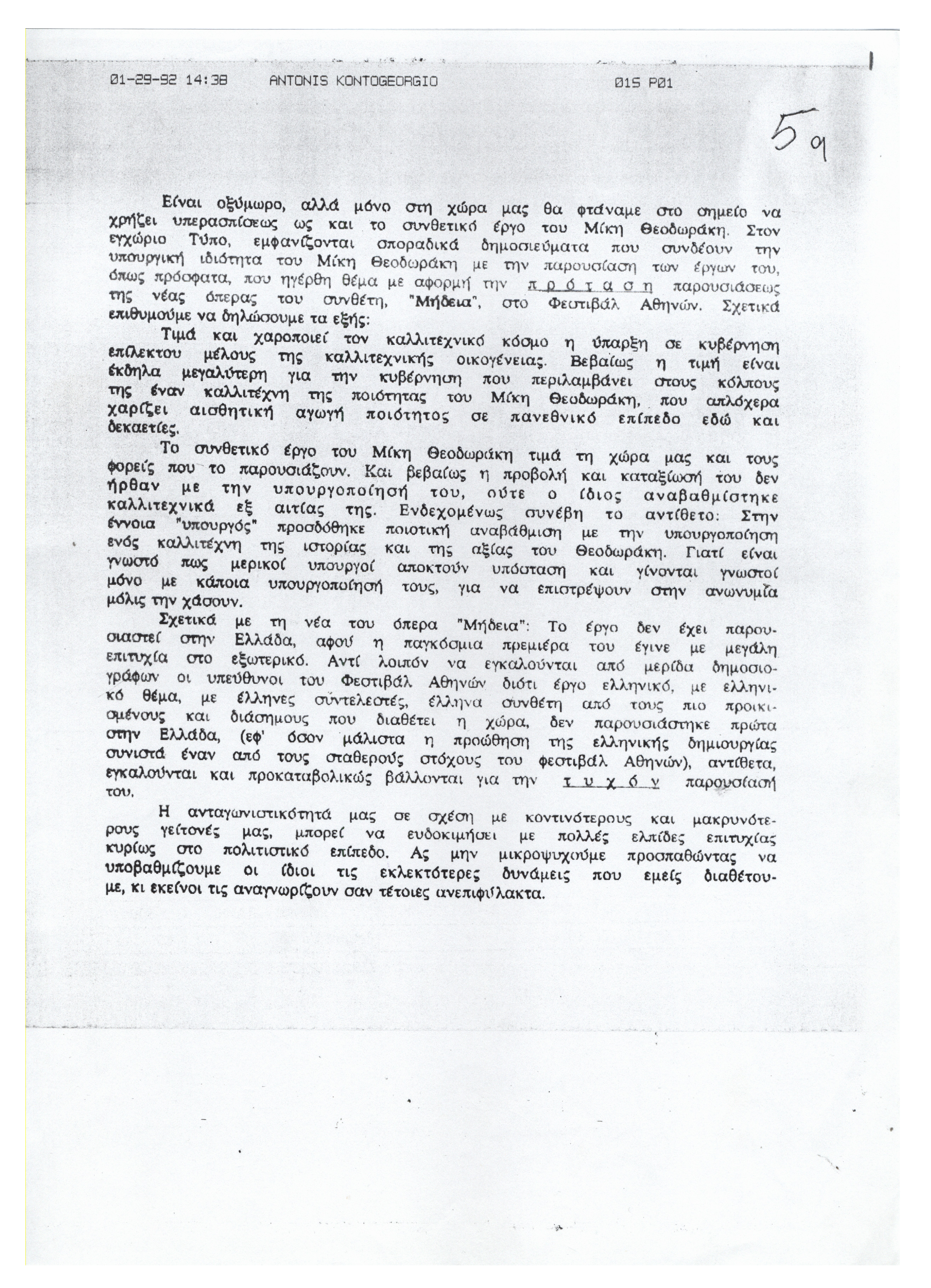 Κείμενο του Αντώνη Κοντογεωργίου διευθυντή της χορωδία της Ε.Ρ.Τ. με το οποίο απαντά στα αιχμηρά δημοσιεύματα του τύπου εκείνη την εποχή που ισχυρίζονταν ότι ο προγραμματισμός της εκτέλεσης της όπερας "Μήδεια" στα πλαίσια του Φεστιβάλ Αθηνών έγινε εξαιτίας της υπουργικής θέσης την οποία εκείνη την εποχή κατείχε ο Μίκης Θεοδωράκης