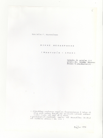 Κείμενο "Μίκης Θεοδωράκης, Μαρτυρία: 1943" Β. Κουτσούγερα, το οποίο εντάχθηκε σαν επίλογος στον Ε΄τόμο του βιβλίου "Δρόμοι του Αρχαγγέλου"