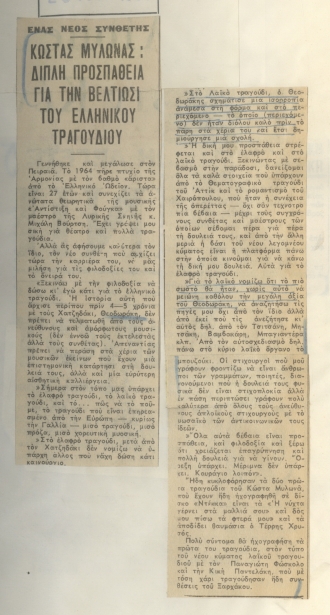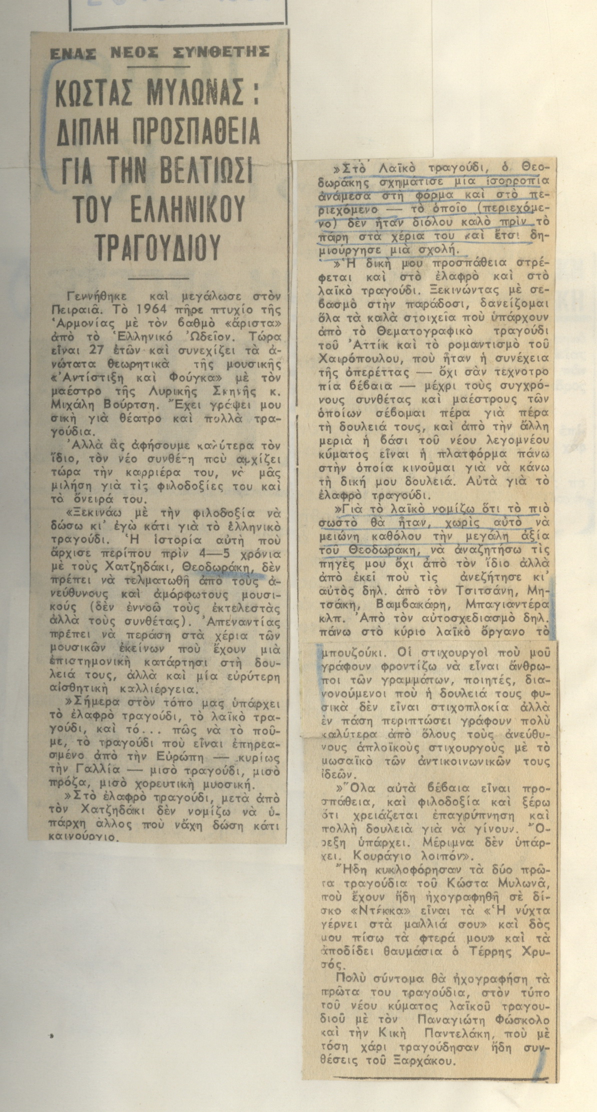 Κώστας Μυλωνάς: Διπλή προσπάθεια για τη βελτίωσι της ελληνικής μουσικής 05.11.2014 ΔΗΜΟΣΙΕΥΣΗ ΠΡΩΤΟΤΥΠΟΥ: 25/6/1965