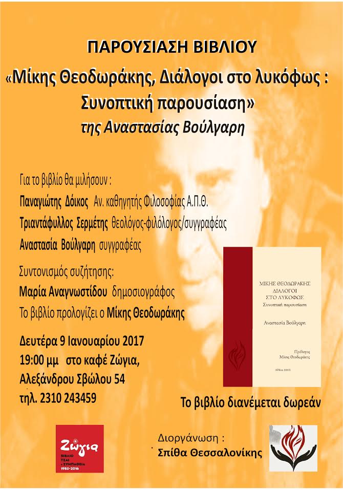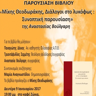 Τη Δευτέρα 9 Ιανουαρίου 2017 και ώρα 19:00 θα παρουσιαστεί το βιβλίο της Αναστασίας Βούλγαρη «Μίκης Θεοδωράκης, Διάλογοι στο λυκόφως: Συνοπτική παρουσίαση» στο καφέ Ζώγια, Αλεξάνδρου Σβώλου 54.