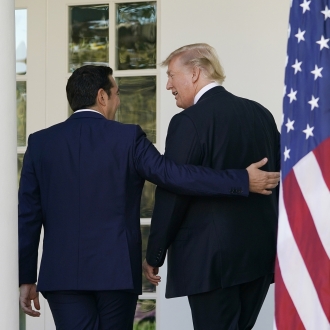 Η φωτογραφία δείχνει τις πλάτες του Τραμπ και του Τσίπρα, καθώς προχωρούν. Ο δικός μας, αριστερά του Τραμπ, με το δεξί του χέρι έχει αγκαλιάσει τον Πρόεδρο της Αμερικής. Τον παγκόσμιο ηγέτη των μεγαλοθηρευτών. Τον δεινόσαυρο! Τι να του λέει άραγε μετά το δημόσιο λιβάνισμα μπροστά στις κάμερες, με κείνα τα περί «διαβολικής» επιδεξιότητας που τελικά καταλήγει στο …. καλό;