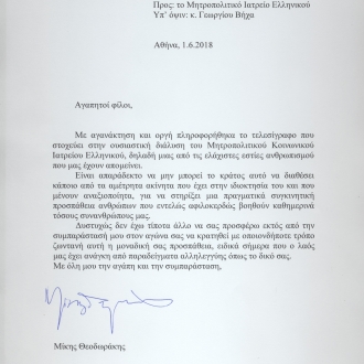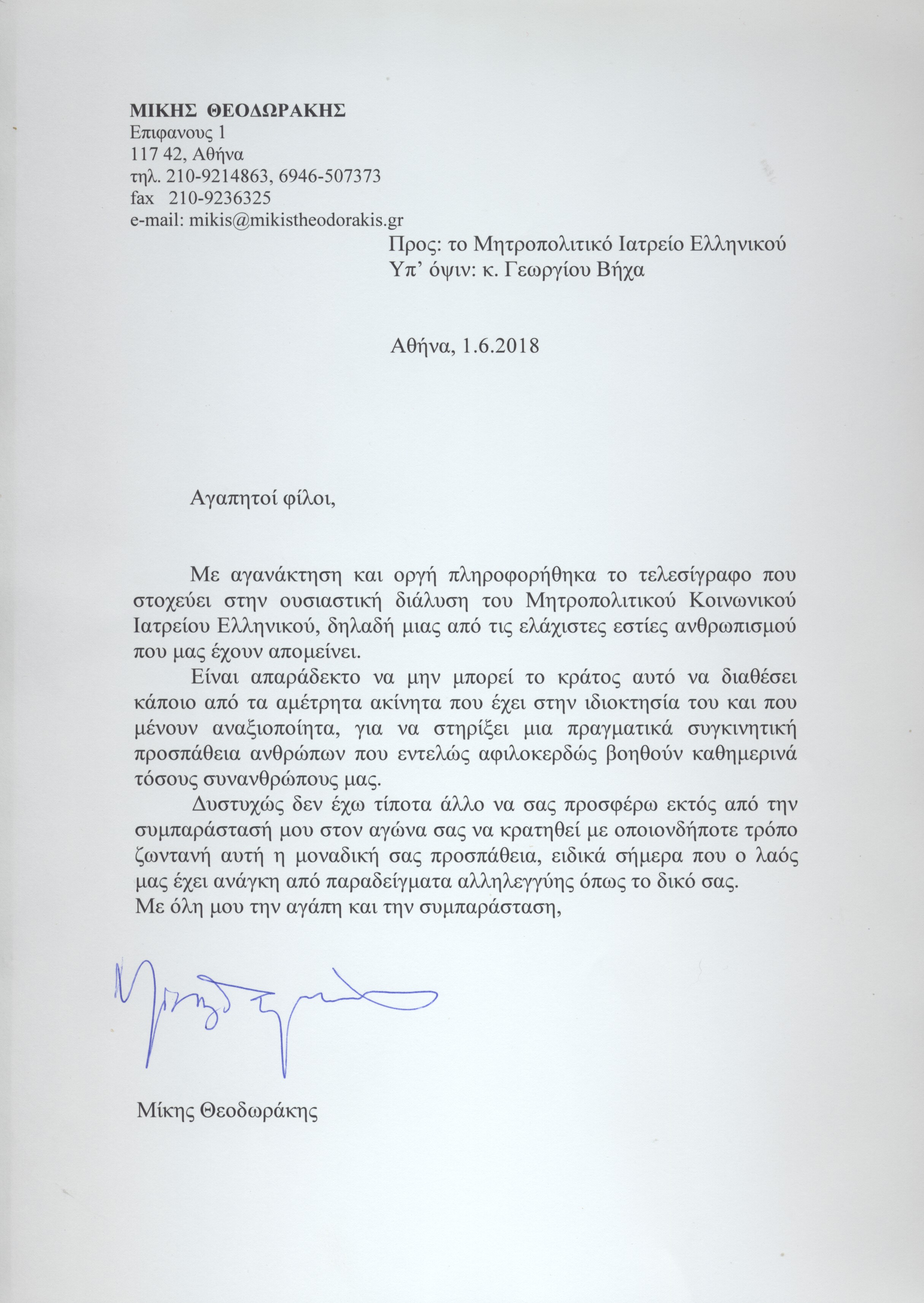 Επιστολή Συμπαράστασης του Μίκη Θεοδωράκη στο Μητροπολιτικό Ιατρείο Ελληνικού